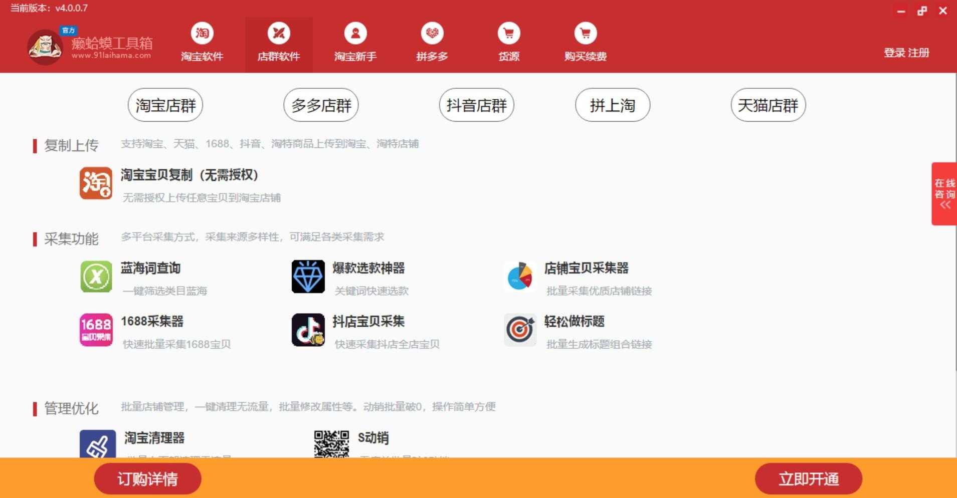 淘系全部43个功能:按照使用类型不同,划分为:数据分析、直通车、生意参谋、补单黑科技、其他复制等五个模块。又根据不同阶段商家的需求独立了:淘宝新手、店群软件等两个板块,店群板块又细分了:淘宝店群、多多店群、抖音小店,以及部分热门功能的单软件模式,让不同需求不同类型的商家,都能选择最适合自己的功能版本。