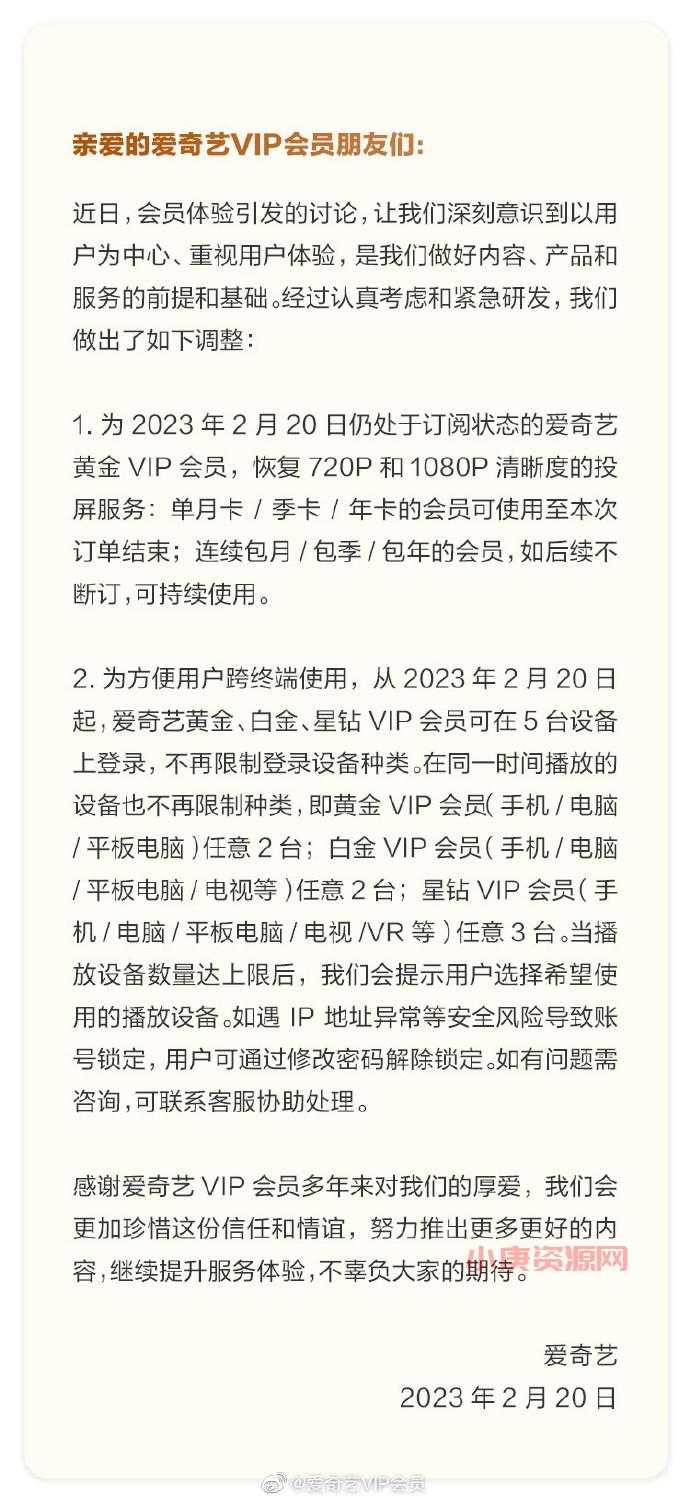 爱奇艺表示,为 2023 年 2 月 20 日仍处于订阅状态的爱奇艺黄金 VIP 会员,恢复 720P 和 1080P 清晰度的投屏服务:单月卡 / 季卡 / 年卡的会员可使用至本次订单结束;连续包月 / 包季 / 包年的会员,如后续不断订,可持续使用。