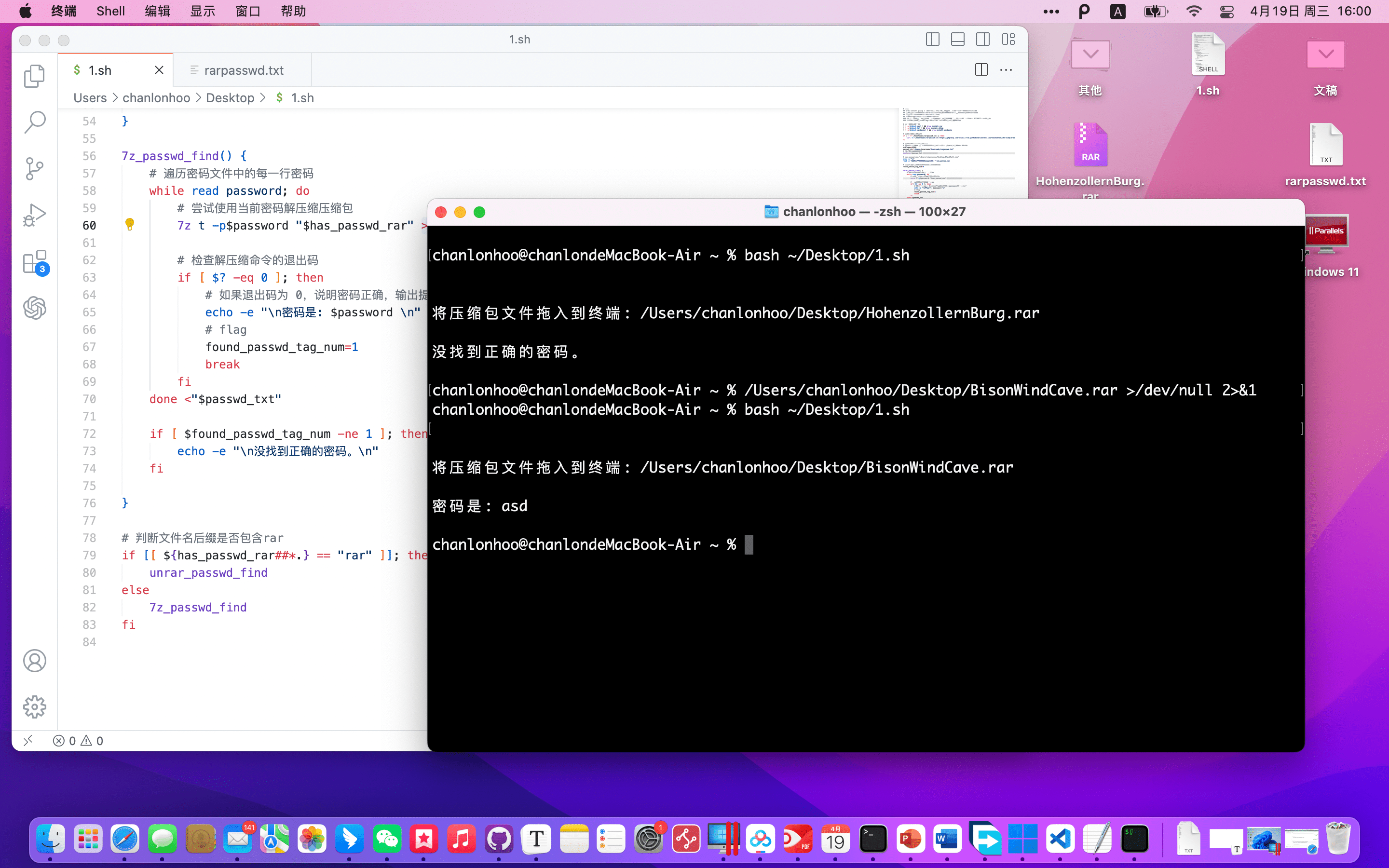 brew install p7zip > /dev/null 2>&1运行效率较低,也算是个无心之举。跑代码测试的时候,我发现这种写法,明显感觉比if慢好多,所以就pass掉了。在Mac上,7z并不支持验证rar压缩包密码;Mac下面的rar,也不支持zip的密码验证。这个是p7zip与rar(两者都是 brew 安装)的实验结论。
