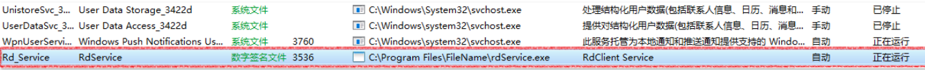 并添加系统服务来进行持久化操作,服务名为Rd_service,当计算机启动时RdViewer会静默启动,相关服务信息,如下图所示: