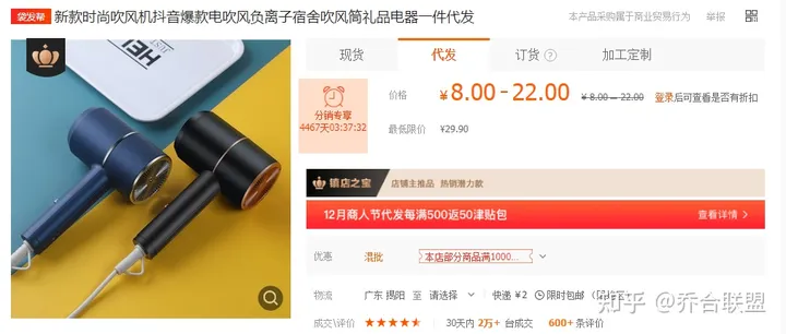 阿里巴巴一件代发包邮的吹风机最便宜仅需8元,我们拿到闲鱼上卖到29.9元是没有任何问题的;