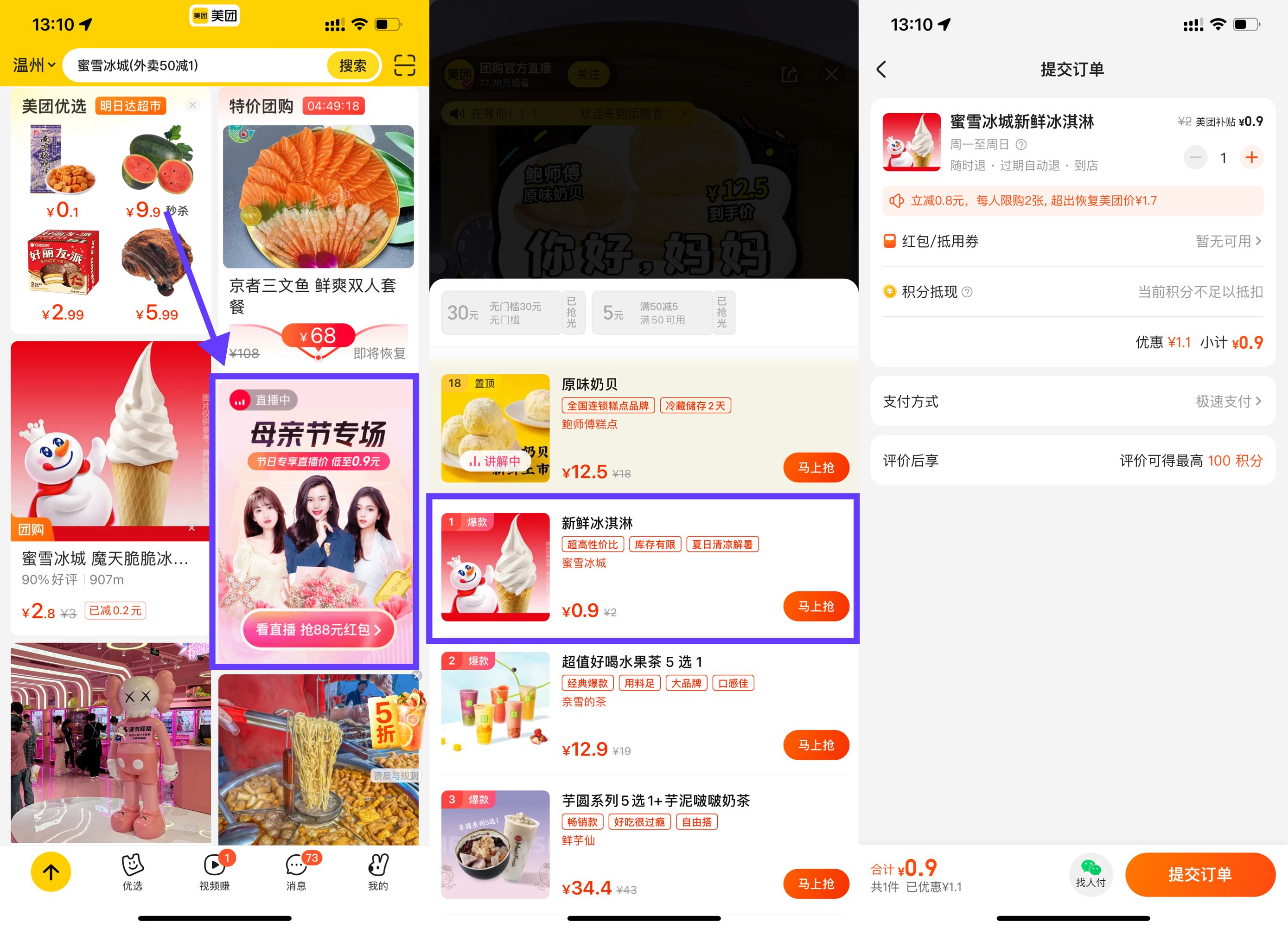 美团APP首页“母亲节专场”->购物袋找到0.9元蜜雪冰城冰淇淋,最多可购买2个,到店核销自取即可