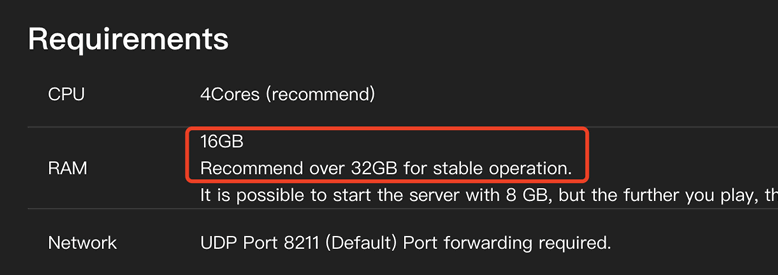 因为幻兽帕鲁官方推荐配置就是CPU:4核,内存:16GB或以上的套餐配置。