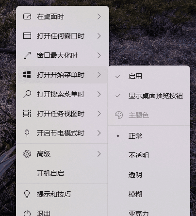 软件除了使任务栏透明,还提供了任务栏颜色设置与动态模式下设置,具体可自行摸索。